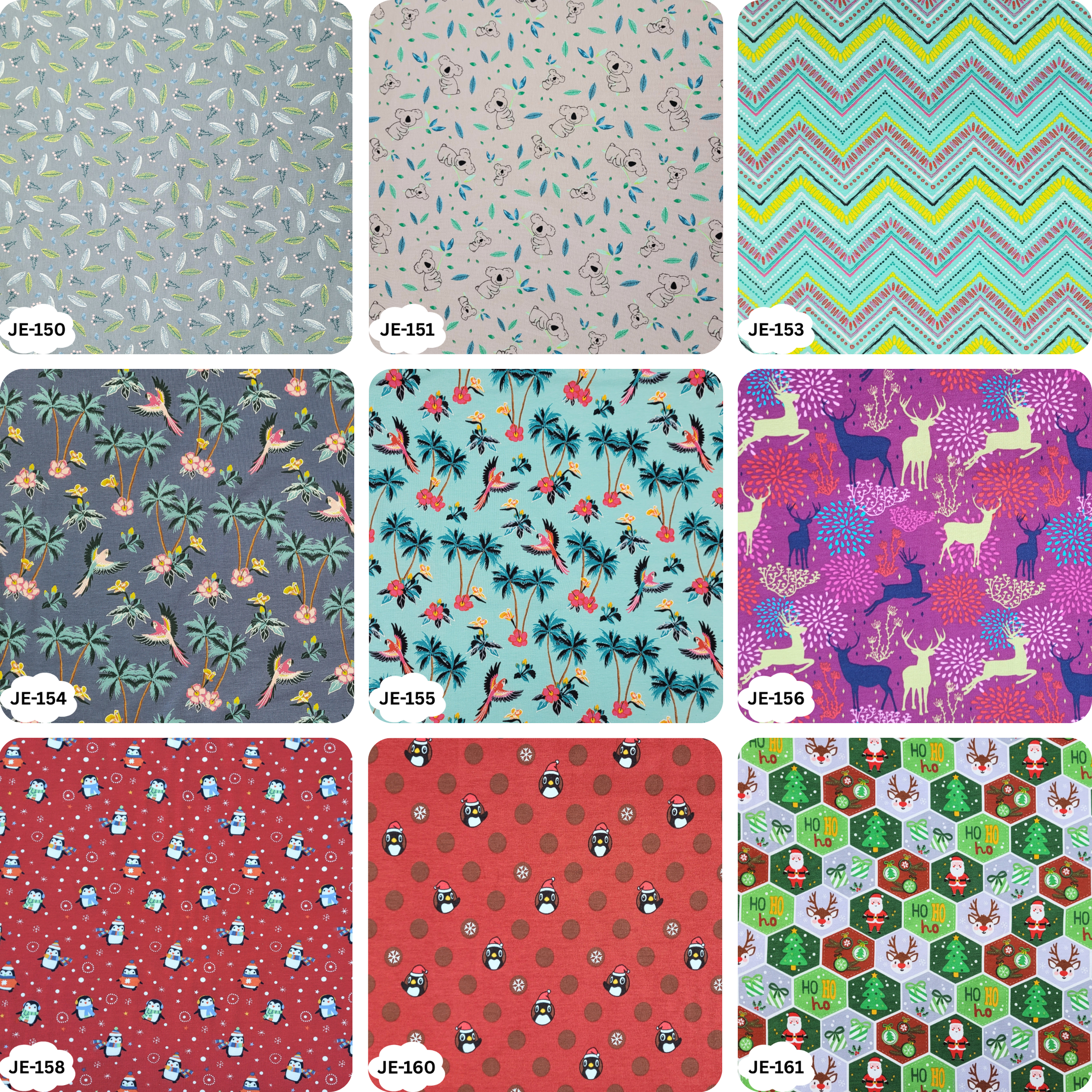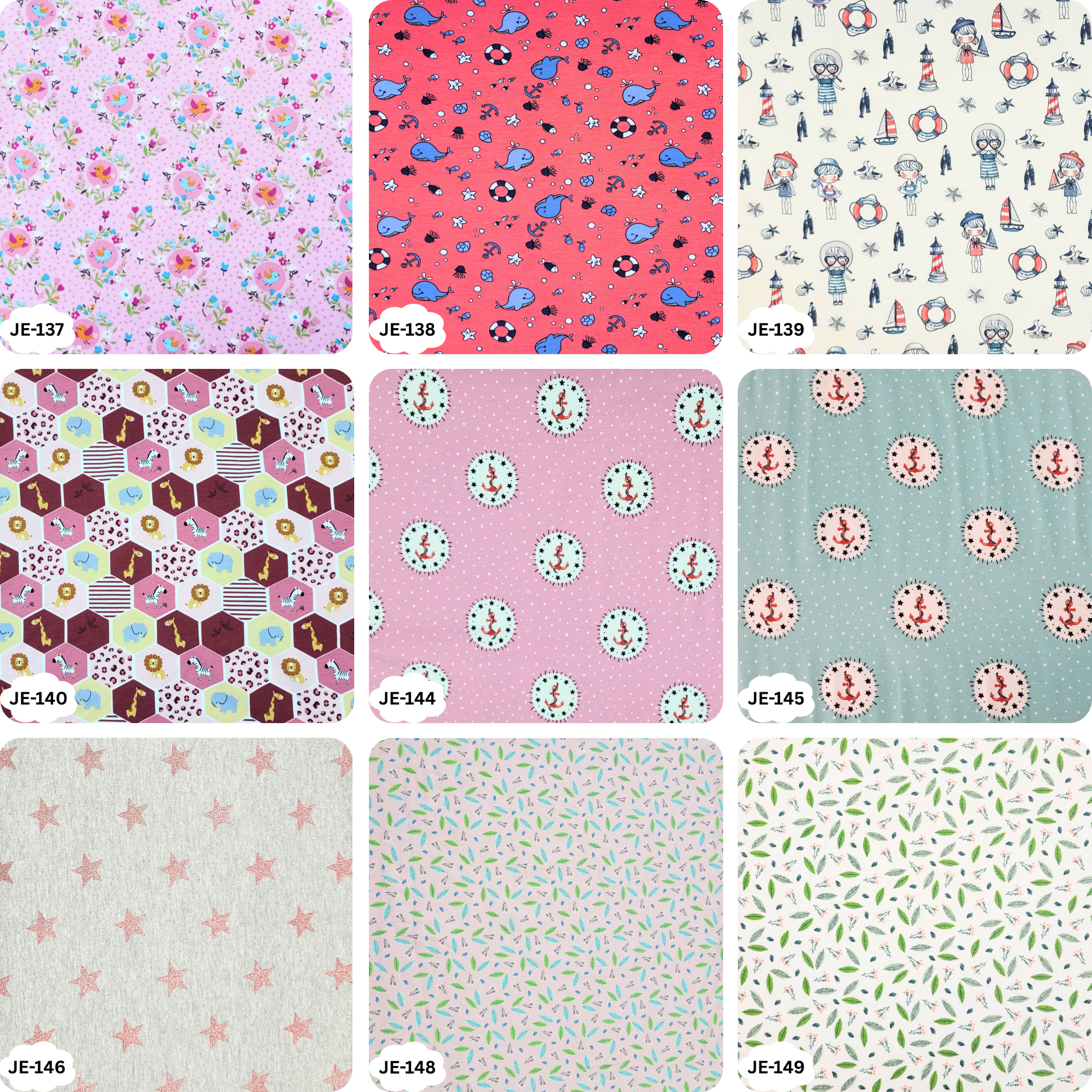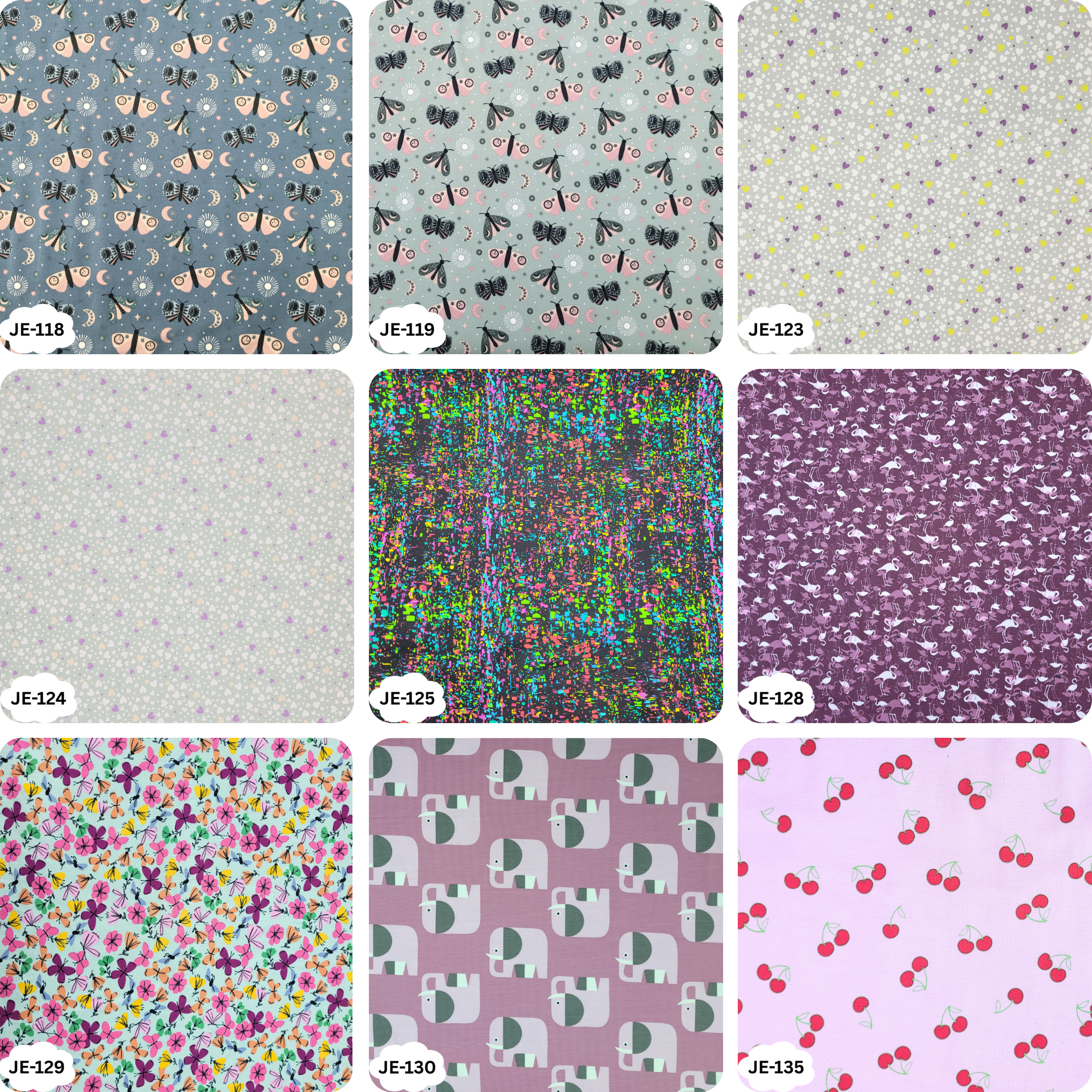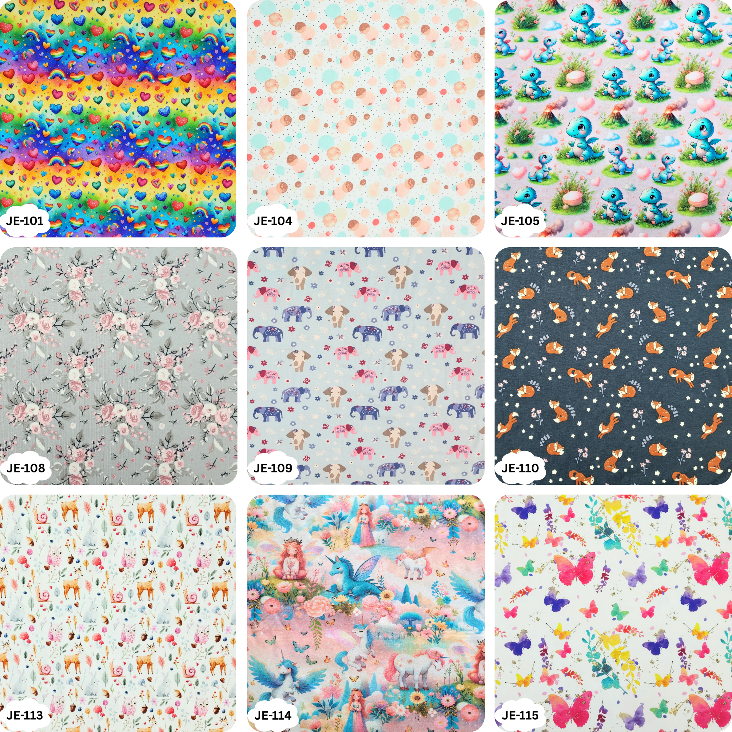 JE-101-Herzchen-Bunt, JE-104-Bubbles, JE-105-Drache-mit-Vulkan, JE-108-Floral-Grau, JE-109-Elefant-Floral, JE-110-Fuechse-Floral, JE-113-Waldtiere, JE-114-Einhörner-Feen, JE-115-Bunte-Schmetterlinge, JE-118-Nachtfalter-Blau, JE-119-Nachtfalter-Mint, JE-123-Herzchen-Grau, JE-124-Herzchen-Mint, JE-125-Farbsprenkel, JE-128-Flamingo, JE-129-Schmetterlinge-Floral, JE-130-Elefanten-Rosa, JE-135-Kirschen-Rosa, JE-137-Vogel-Floral, JE-138-Wale-Maritim-Koralle, JE-139-Strandliebe, JE-140-Waben-Maedchen, JE-144-Anker-Rosa, JE-145-Anker-Hellblau, JE-146-Rosa-Sterne, JE-148-Floral-Altrosa, JE-149-Floral-Weiss, JE-150-Floral-Gruen, JE-151-Koala-Altrosa, JE-153-Zacken-Maedchen, JE-154-Papagei-Blau, JE-155-Papagei-Hell-Tuerkis, JE-156-Hirsch-Beere, JE-158-Pinguin-Winter-Rot, JE-160-Pinguin-Schneeflocke-Rot, JE-161-Waben-Weihnachten