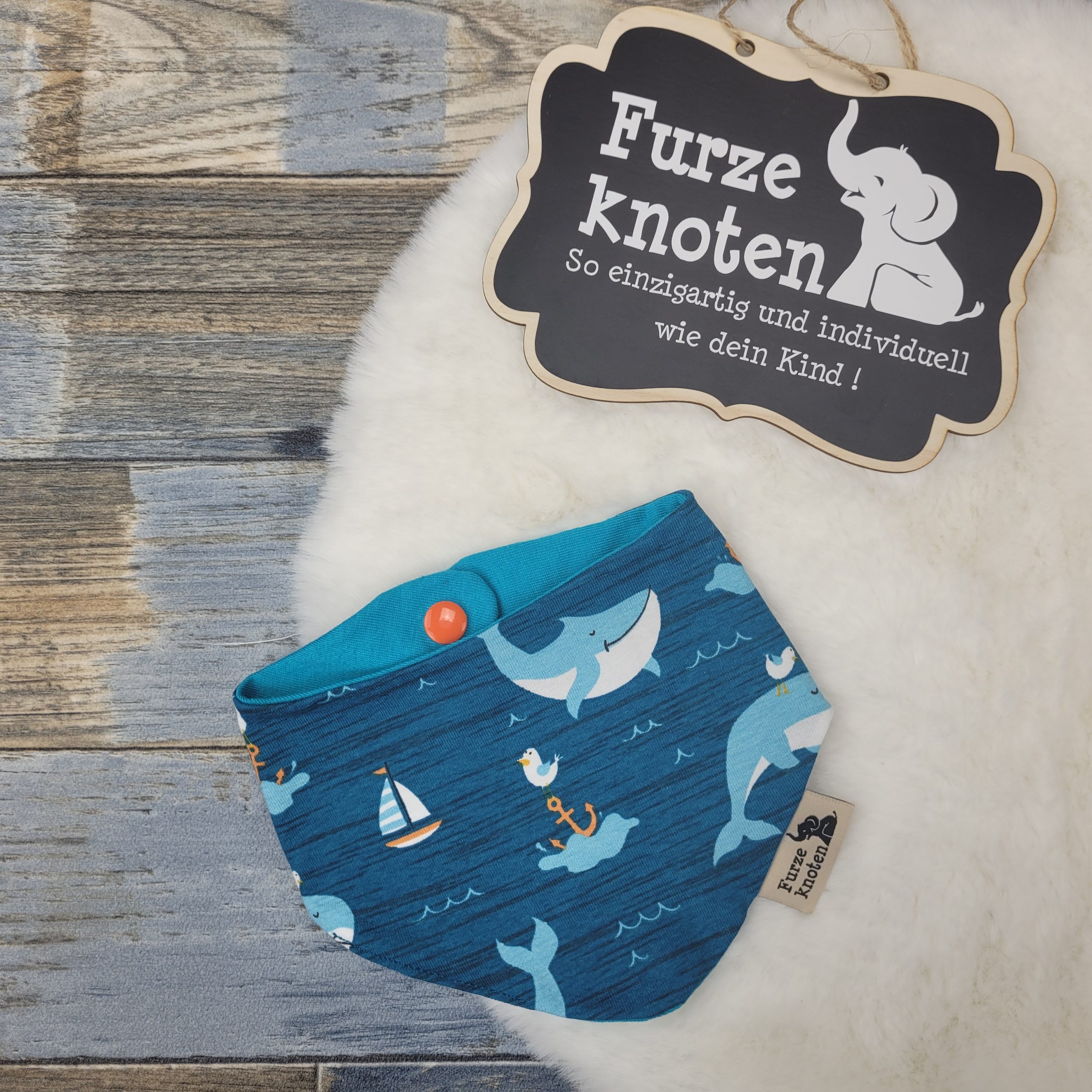 Das Tuch wurde aus einem schönen Motivstoff mit farblich passender, einfarbiger Rückseite gefertigt. Dadurch ist es noch vielseitiger kombinierbar. Geschlossen wird es mit einem farblich passenden Druckknopf aus Kunststoff oder Metall.