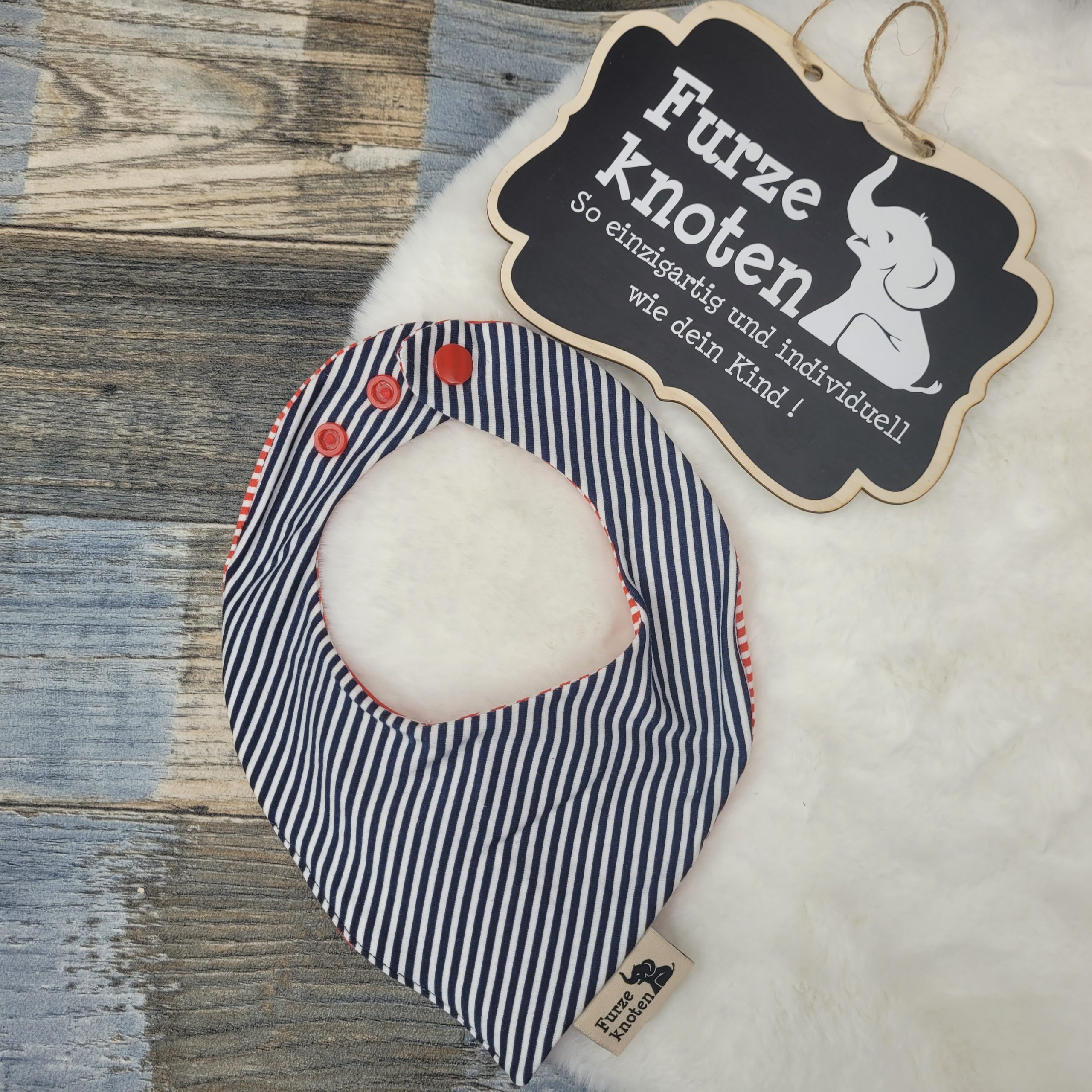 Das Tuch wurde aus einem schönen Motivstoff mit farblich passender Rückseite gefertigt. Dadurch ist es noch vielseitiger kombinierbar. Geschlossen wird es mit einem farblich passenden Druckknopf aus Kunststoff oder Metall. Bei diesem Halstuch ist dieser in 3 Größen verstellbar. Die Rückseite ist Rot/Weiß gestreift.