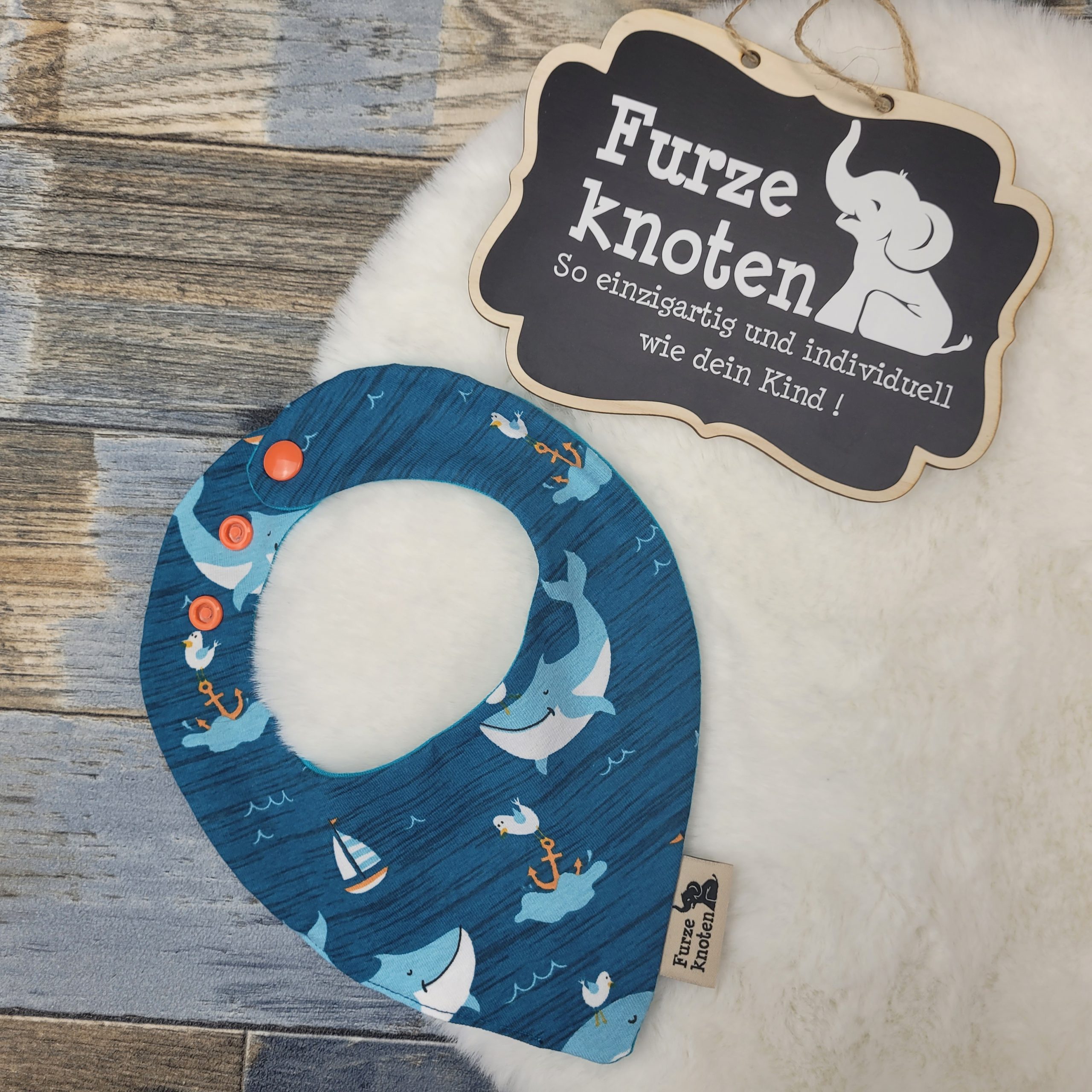 Das Tuch wurde aus einem schönen Motivstoff mit farblich passender, einfarbiger Rückseite gefertigt. Dadurch ist es noch vielseitiger kombinierbar. Geschlossen wird es mit einem farblich passenden Druckknopf aus Kunststoff oder Metall. Bei diesem Halstuch ist dieser in 3 Größen verstellbar.