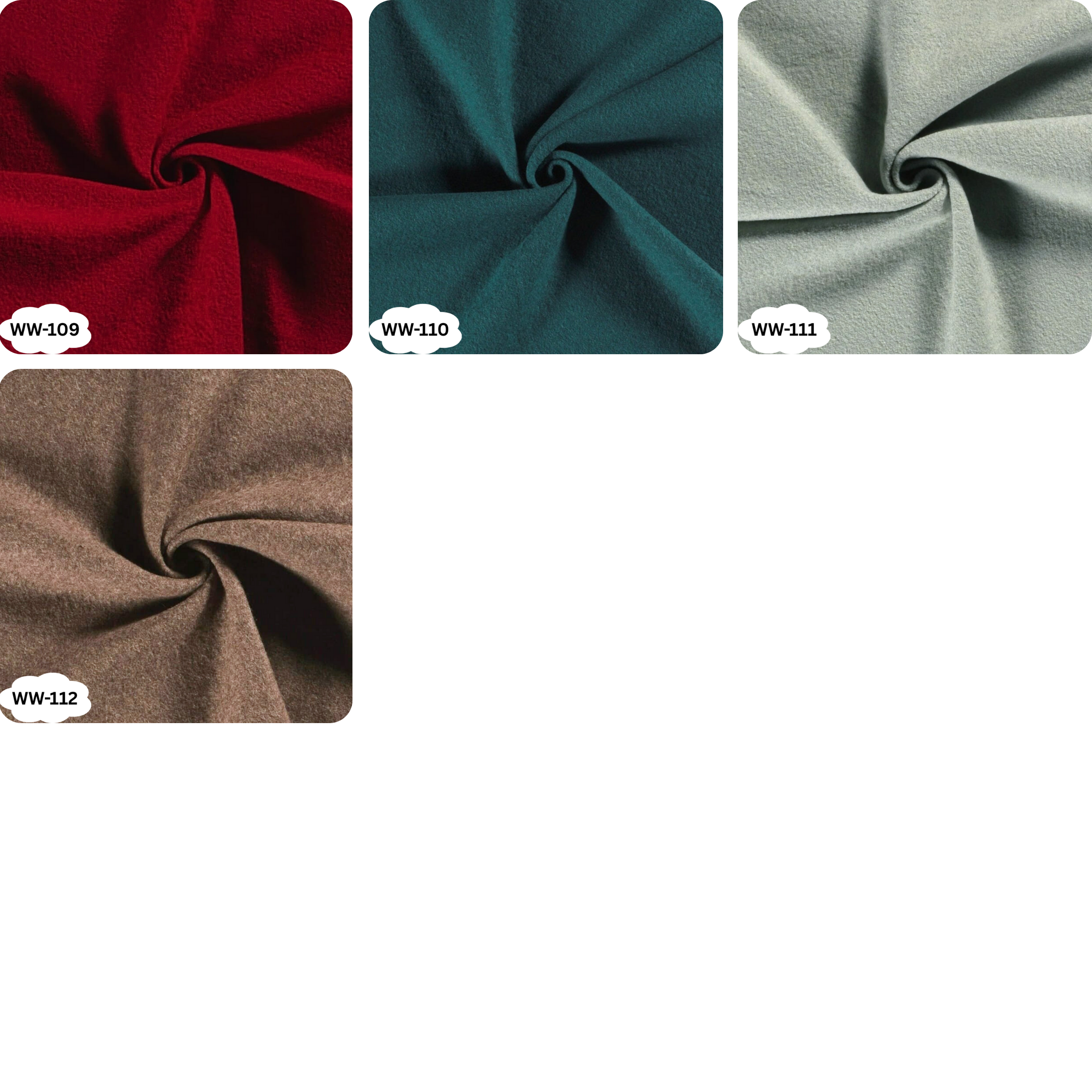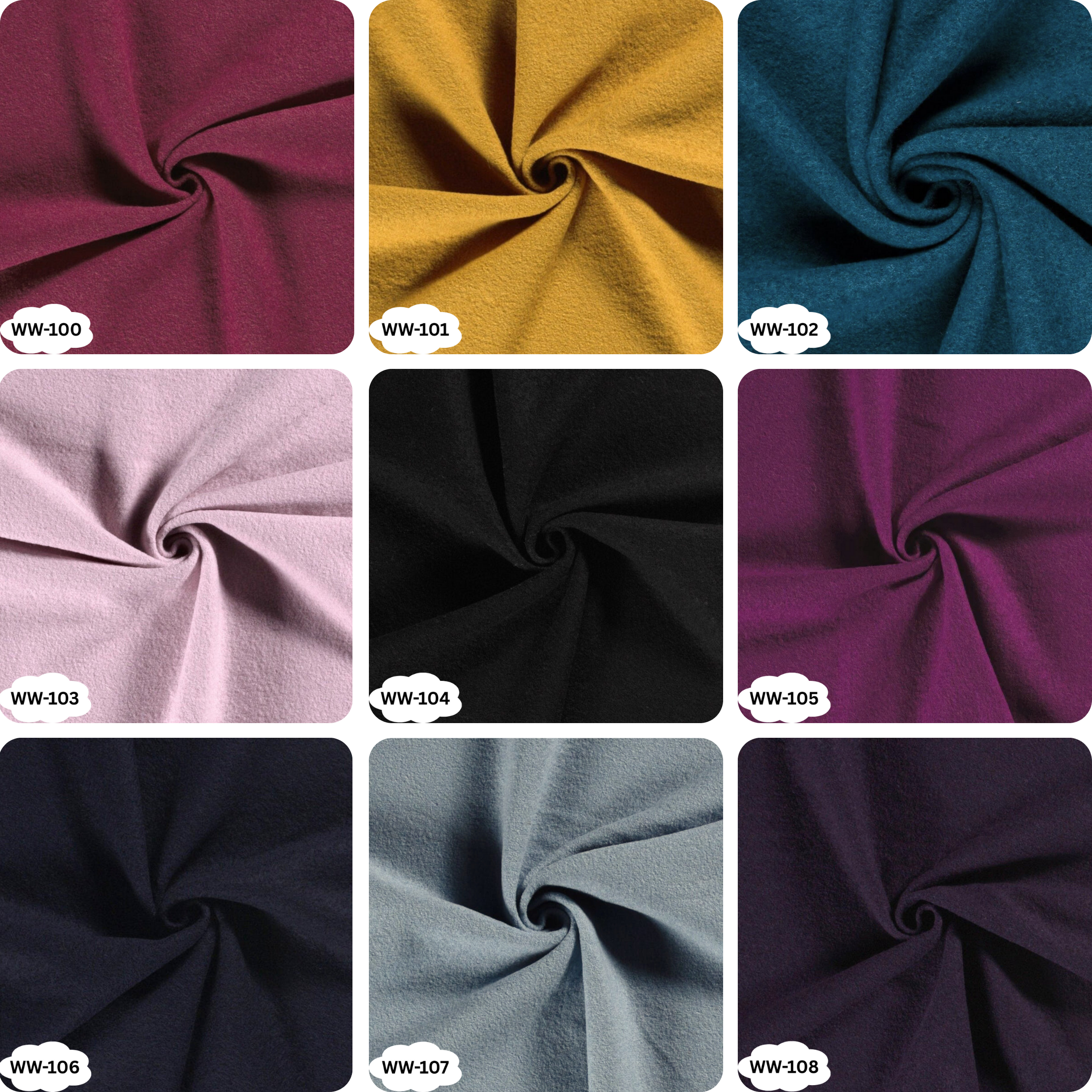 WW-100 Fuchsia, WW-101 Senfgelb, WW-102 Petrol, WW-103 Hell Rosa, WW-104 Schwarz, WW-105 Magenta, WW-106 Navy, WW-107 Rauchblau, WW-108 Aubergine, WW-109 Rot, WW-110 Türkis, WW-111 Mint, WW-112 Braun
