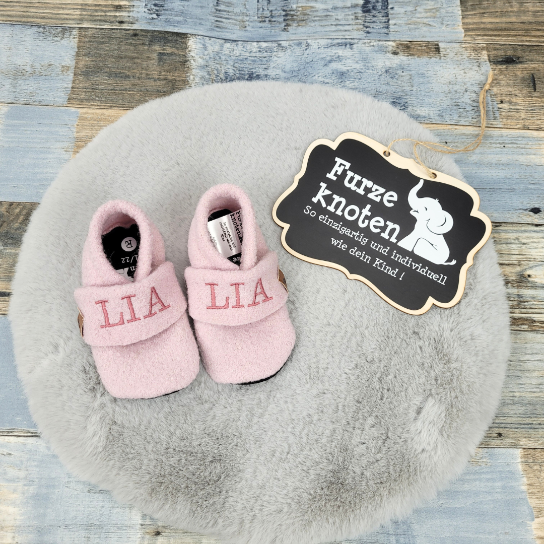 Auf Wunsch können die Puschen auch mit dem Namen des Kindes bestickt werden. So werden sie noch individueller und einzigartiger. Auch erleichtert es das Zuordnen der Puschen und mindert so die Verwechslungsgefahr z.B im Kindergarten. Wenn Du den Schuhen eine persönliche Note verleihen möchtest, einfach den Haken bei „besticken“ setzen, den Wunschnamen eingeben und die gewünschte Farbe auswählen.  Schon werden die Puschen nach Deinen Wünschen hergestellt.